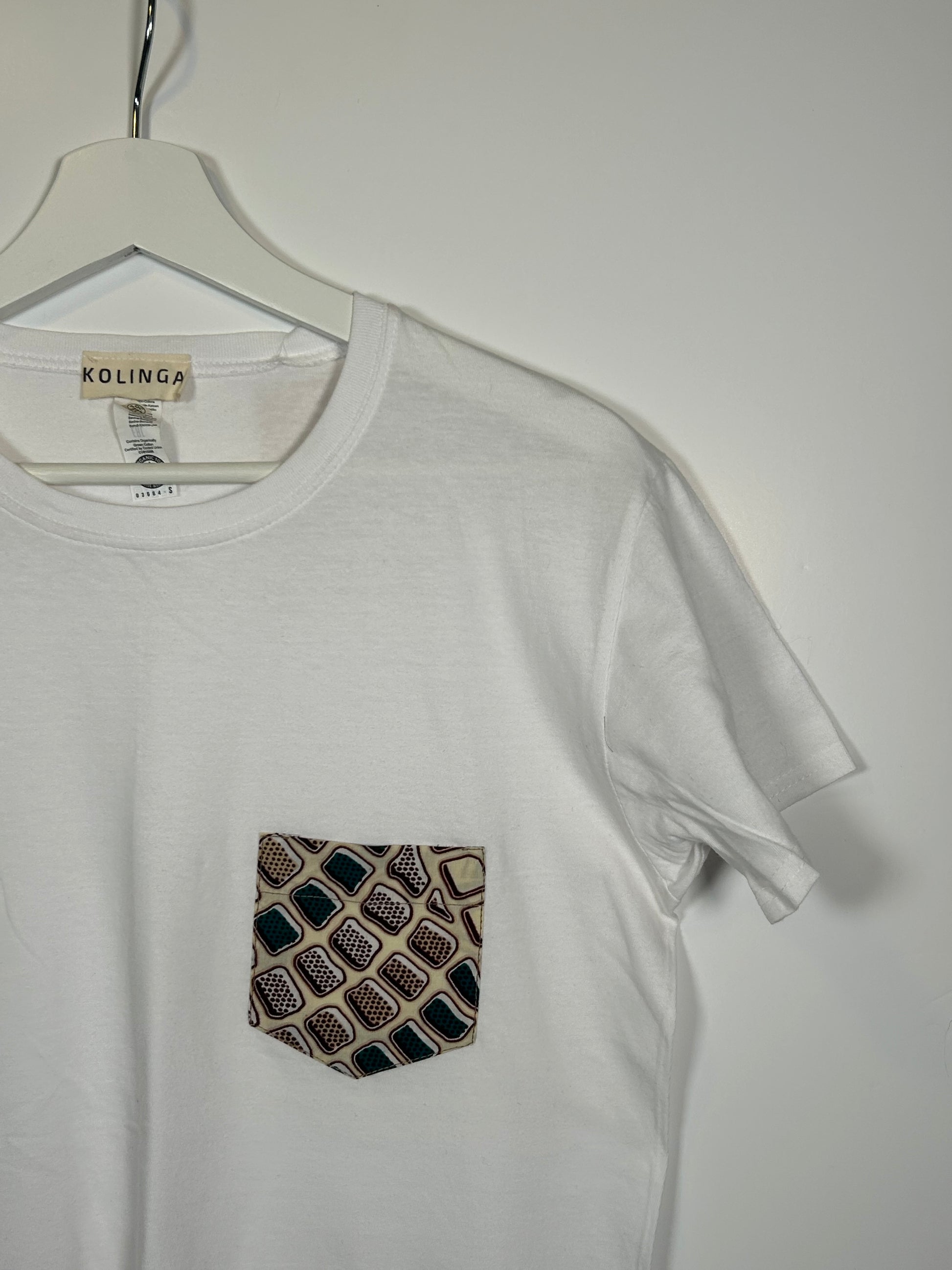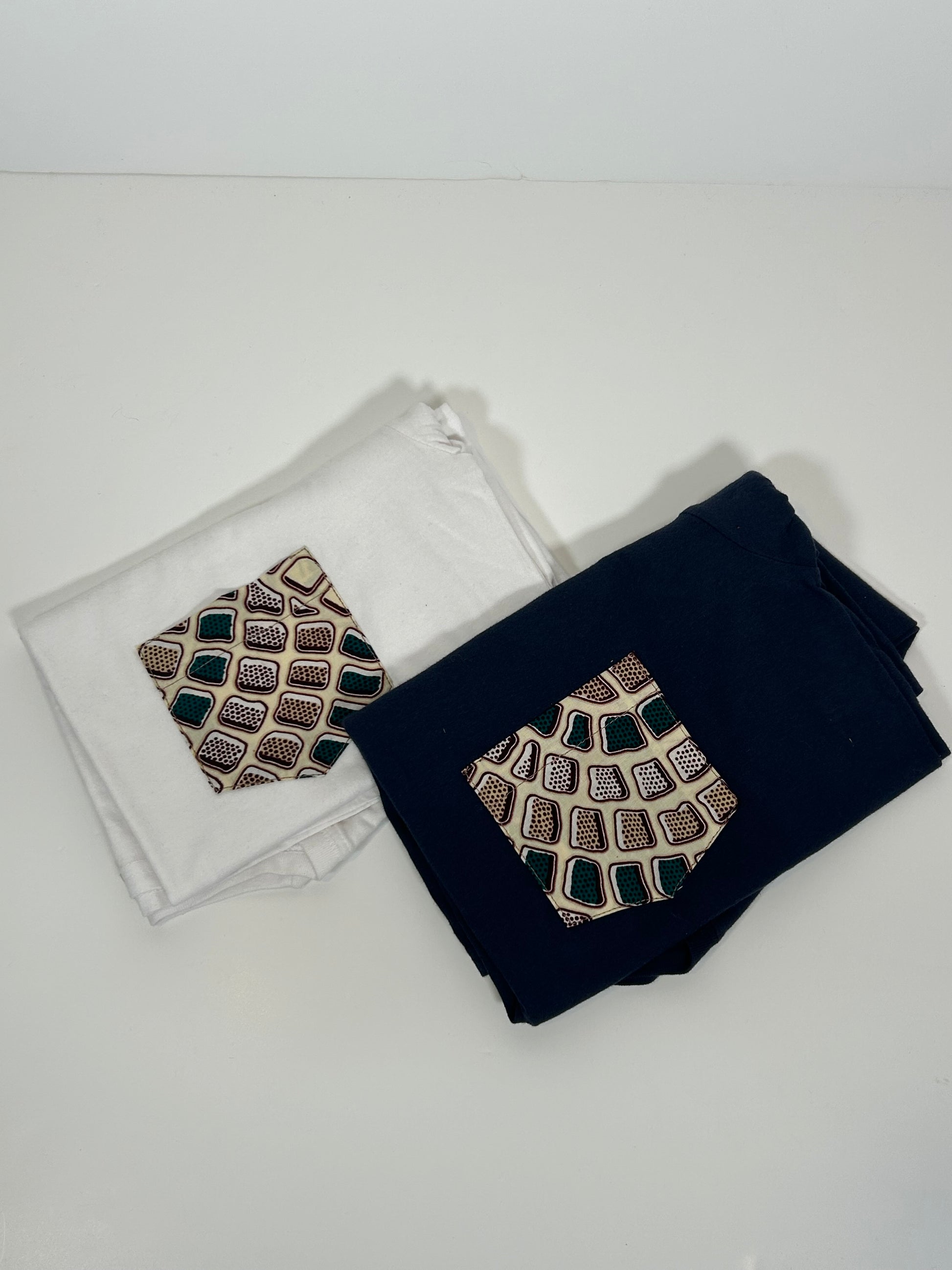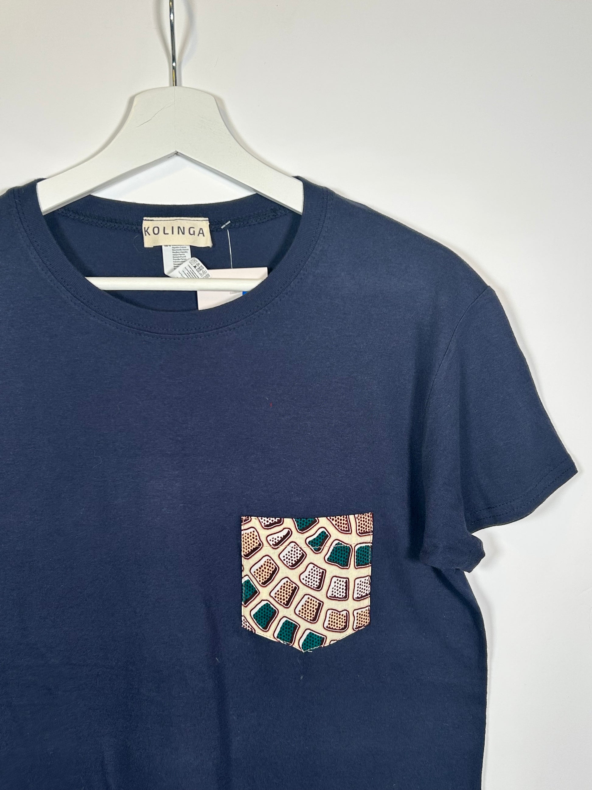 Deze uniseks T-shirts zijn voorzien van een opvallend en aantrekkelijk handgestikt borstzakje, gemaakt van 100% traditionele Afrikaanse stof in België.
